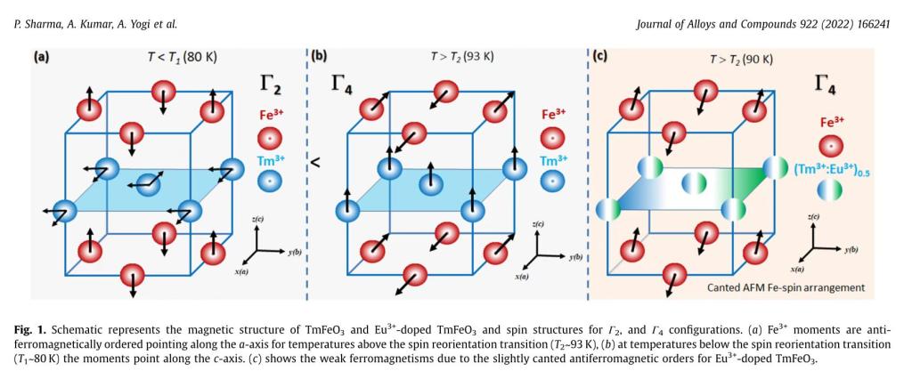 Thulium orthoferrite, TmFeO3crystallizes in an orthorhombic perovskite structure as schematically shown in Fig. 1. The magnetic anisotropy of TmFeO3undergoes dramatic changes as a function of temperature and due to this large magnetic anisotropy; magnetic phases such as Г4, Г24, and Г2can appear with respect to temperature. TmFeO3have high Néel temperature,TN~ 632 K with G- type antiferromagnetic order.
