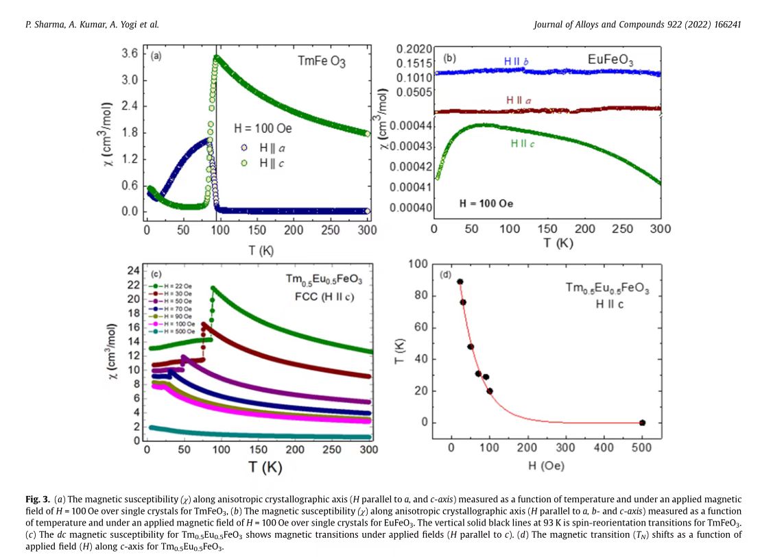 最近,太阳成集团tyc122ccvip智能控制与电子器件应用技术泸州市重点实验室Poorva Sharma副教授和Ashwini Kumar副教授团队与上海大学量子与分子结构国际中心物理系的曹世勋教授合作,在基于稀土离子的多功能材料方面取得了重要进展。作者使用光学浮区炉设计并合成了Eu3+离子掺杂的TmFeO3单晶,发现外部磁场对Eu3+-离子掺杂TmFeO 3中的磁性和自旋重取向转变有很大影响。研究结果说明了磁跃迁的重要性,并为实现先进的多功能材料提供了策略。题为“Robust magnetic-field effect on spin-reorientation in Eu3+-modified TmFeO3single crystals”的相关研究工作在线发表在顶级国际学术期刊《合金与化合物杂志》上。